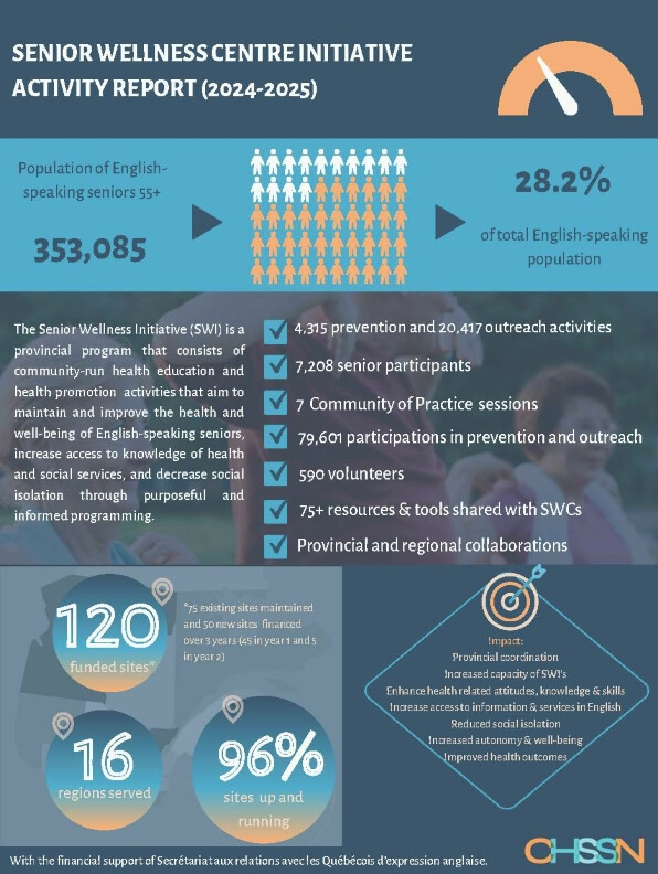 Seniors CHSSN Publications CHSSN Senior Wellness Centre Initiative Activity Report 2024-2025 – Infographic Published: June 11, 2025 Download Documents CHSSN Publications CHSSN Senior Wellness Centre Initiative Activity Report 2024-2025 – Infographic