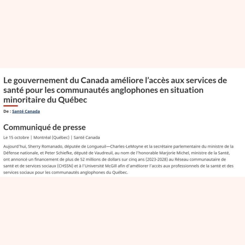Mobilisation de la communauté Initiative de réseautage et de partenariat (NPI) L’Initiative de réseautage et de partenariat (NPI) est un projet qui soutient le développement et la mobilisation des réseaux de santé et de services sociaux pour les communautés d’expression anglaise de la province de Québec. 2023 – 2028 Améliorer l’accès aux services de santé et aux services sociaux pour la population de langue anglaise Le projet NPI est ce qui a inspiré notre modèle de mobilisation communautaire, qui utilise une approche de promotion de la santé de la population. Cette approche encourage les partenaires locaux et régionaux, ainsi que les communautés d’expression anglaise, à renforcer les relations avec les prestataires de services sociaux et de santé et à s’attaquer aux principaux déterminants de la santé. Nous soutenons également les efforts de renforcement des capacités du NPI en offrant un développement du leadership. Le NPI est conçu autour de cinq activités principales : Réseautage Construire une table de réseau et créer des opportunités pour partager des informations, identifier les problèmes, les défis et les solutions telles que l’amélioration des services. Représentation Participer aux tables consultatives et décisionnelles ainsi que représenter les besoins et les défis de la communauté d’expression anglaise. Développement des connaissances Élaborer et diffuser des recherches fondées sur des preuves, telles que des statistiques et des priorités, et partager les meilleures pratiques. Partenariats Créer des projets en collaboration avec des partenaires de la santé et des services sociaux, comme un projet de démonstration ou un projet pilote. Rayonnement Atteindre les citoyens d’expression anglaise vulnérables et isolés, et les aider à accéder aux services sociaux et de santé en anglais. Qu’est-ce qu’un NPI ? Carte NPI Services pour vieillir en santé au bon endroit (SHARP) Services pour vieillir en santé au bon endroit (SHARP) est une activité de sensibilisation qui aide les NPI à organiser des séances d’information dans leurs communautés afin de promouvoir et d’améliorer l’accès aux services existants qui sont disponibles pour aider les aînés à vieillir sur place, ou à vieillir dans leur communauté aussi longtemps qu’ils le souhaitent. Huit séances d’information virtuelles sont organisées chaque année, le troisième mercredi du mois, pour mettre en lumière les services qui aident les aînés à vieillir sur place, tels que les soins et l’adaptation à domicile, les possibilités de bénévolat et d’autres moyens de rester en contact, le transport, le soutien à la nutrition et à l’activité physique, la prévention des chutes, le soutien aux soignants, etc. Les NPI peuvent participer et améliorer l’accès à l’information en anglais par le biais de partenariats et de l’éducation de trois manières : Organiser des événements en direct pour assister au webinaire en groupe ; Partager l’information sur l’événement avec leur communauté et les aînés participent en direct depuis leur domicile. Utiliser les enregistrements et le matériel dans les futurs programmes. Cette initiative est financée par : Les organismes participant à l’initiative NPI Initiative de réseautage et de partenariat (NPI) En vedette dans les médias Le gouvernement du Canada De : Santé Canada Le gouvernement du Canada améliore l’accès aux services de santé pour les communautés anglophones en situation minoritaire du Québec – Communiqué de presse, Le 15 octobre | Montréal (Québec) | Santé Canada CBC Montréal (disponible en anglais uniquement) Ottawa investit 52 millions de dollars pour renforcer les services de santé en anglais au Québec. Le financement vise à former du personnel bilingue et à améliorer l’accès aux soins – CBC News · Publié le 15 octobre 2025 à 18h33. CBC (disponible en anglais uniquement) Vous avez du mal à obtenir des services de santé en anglais au Québec ? Ottawa tente de vous aider, 15 octobre, CBC News, VIDÉO Durée : 1 min 40 s Un député de la région de Montréal a annoncé un investissement de 52 millions de dollars dans l’éducation, la sensibilisation et la défense des droits afin d’améliorer l’accès aux services de santé en anglais dans la province. Montreal Gazette (disponible en anglais uniquement) Ottawa va dépenser 52 millions de dollars pour améliorer les services de santé en anglais En fait, le gouvernement a présenté cette annonce comme une amélioration de l’accès aux soins de santé pour « les communautés anglophones minoritaires du Québec ». Auteur de l’article : Aaron Derfel • Montreal Gazette Publié le 15 octobre 2025 CTV News – Montréal (disponible en anglais uniquement) Le Canada annonce un investissement de 52 millions de dollars pour les soins de santé dans les communautés anglophones du Québec Par Joe Lofaro Publié le 15 octobre 2025 à 21 h 40 CULT Montréal (disponible en anglais uniquement) Le Canada investit 52 millions de dollars pour améliorer l’accès aux soins de santé en anglais pour les anglophones du Québec Écrit par Lorraine Carpenter 15 octobre 2025 Documents en vedette Ressources connexes Modèle de mobilisation communautaire pour l’amélioration de la santé et du bien-être des communautés d’expression anglaise du Québec Modèle de mobilisation communautaire pour l’amélioration de la santé et du bien-être des communautés d’expression anglaise du Québec – 2023 Rapport sur les priorités des communautés d’expression anglaise du Québec en matière de santé et de services sociaux Étapes de développement de partenariats NPI Modèle de mobilisation communautaire pour l’amélioration de la santé et de la vitalité des communautés d’expression anglaise au Québec MODÈLE DE MOBILISATION COMMUNAUTAIRE pour l’amélioration de la santé e