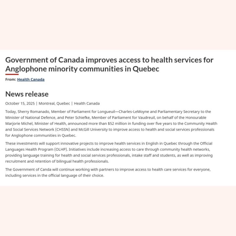 Community Mobilization Networking and Partnership Initiative (NPI) The NPI is a project that supports the development and mobilization of health and social service networks for English-speaking communities throughout the province of Quebec. 2023 – 2028 Improving access to health & social services for the English-speaking population The NPI project is what inspired our Community Mobilization Model, which uses a population health promotion approach. This approach encourages local and regional partners, as well as English-speaking communities, to strengthen relationships with health and social service providers and address key health determinants. We also support the NPI’s capacity building efforts by offering leadership development. The NPI is designed around five core activities: Networking Building a network table and creating opportunities to share information, identify issues, challenges and solutions such as service improvements. Representation Participating on advisory and decision-making tables and representing the needs and challenges of the English-speaking community. Knowledge development Developing and disseminating evidence-based research such as statistics and priorities, and sharing best practices. Partnerships Creating projects in collaboration with health and social service partners, such as a demonstration or pilot project. Outreach Reaching vulnerable and isolated English-speakers, and supporting them in accessing health and social services in English. What is an NPI? NPI Map Services for Health Aging in the Right Place (SHARP) Services for Health Aging in the Right Place (SHARP) is an outreach activity that supports NPI’s to host information sessions to their communities to promote and improve access to existing services that are available to help older adults to age in place, or age in their community for as long as they desire. There are 8 virtual information sessions held each year, on the third Wednesday of the month highlighting services that help older adults age in place such as: home care and adaption, volunteering opportunities and other ways of staying connected, transportation, nutrition and physical activity support, fall prevention, caregiver support, etc. NPI’s can participate and enhance access to English-language information through partnerships and education in three ways: Hold live events to attend the webinar together as a group; Share the event information with their community and seniors participate live from home Use recordings and materials in future programming. This initiative is financed by NPI Participating Organizations Networking Partnership Initiatives Featured in Media Government of Canada From: Health Canada improves access to health services for Anglophone minority communities in Quebec – News release October 15, 2025 | Montreal, Quebec | Health Canada CBC News Montreal Ottawa invests $52M to boost English-language health services in Quebec. Funding aimed at training bilingual staff, helping improve access to care – CBC News · Posted: Oct 15, 2025 6:33 PM EDT CBC News Struggling to get health care services in English in Quebec? Ottawa is trying to help, October 15, CBC News, VIDEO Duration1:40 An MP from the Montreal area has announced a $52-million investment into education, outreach and advocacy with the goal of increasing the availability of health-care services in English in the province. Monreal Gazette Ottawa to spend $52 million to boost health services in English In fact, the government framed the announcement as improving access to health care for “anglophone minority communities in Quebec.” Author of the article: By Aaron Derfel • Montreal Gazette Published Oct 15, 2025 CTV News Montreal Canada announces $52M for health care in English-speaking communities in Quebec By Joe Lofaro Published: October 15, 2025 at 9:40PM EDT CULT Montreal Canada invests $52-million to improve access to healthcare in English for Quebec anglos Written by Lorraine Carpenter October 15, 2025 From the Document Centre Related Resources Community Mobilization Model for Improving Health and Well-being of English-speaking Communities in Quebec Community Mobilization Model for improving the health and well-being of English-speaking communities in Quebec – 2023 Socio-Demographic Characteristics of Visible Minorities in Quebec’s English-speaking Communities Stages of NPI Partnership Development graphic Leadership Development : Enhancing the leadership capacity of minority English-language community health and social services network (NPIs) in the province of Quebec